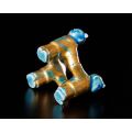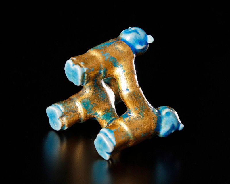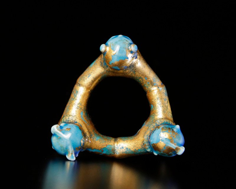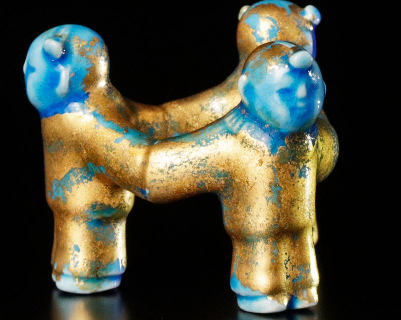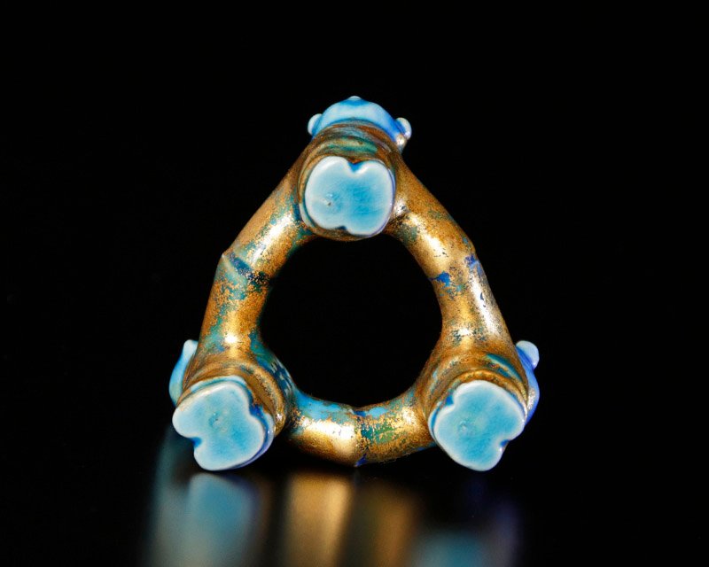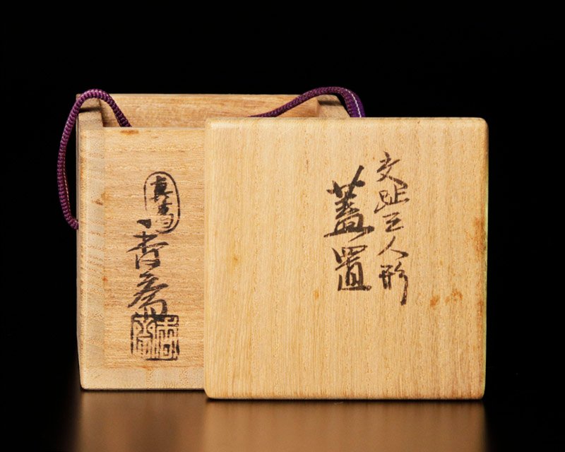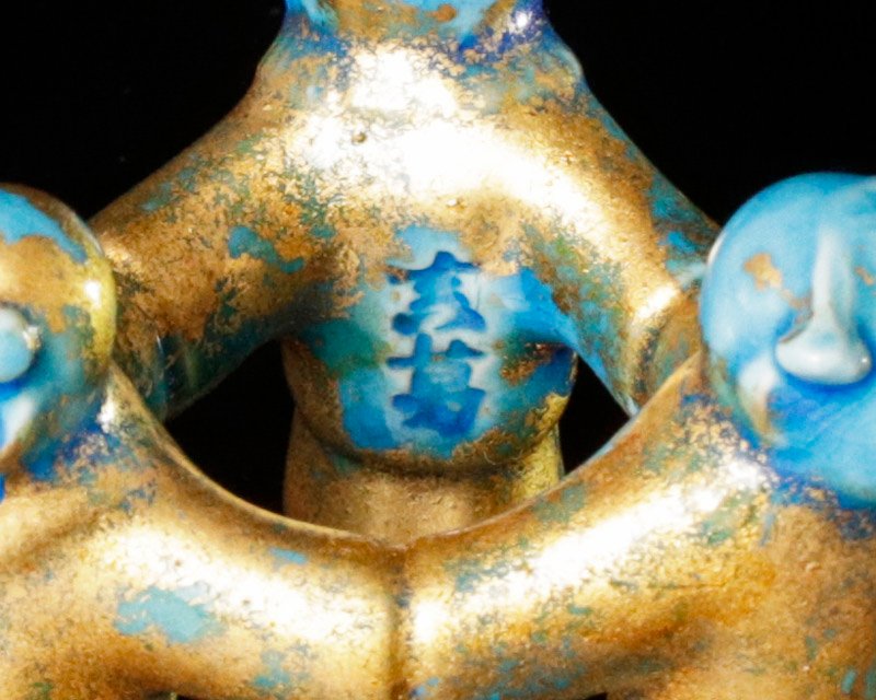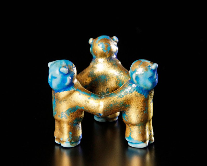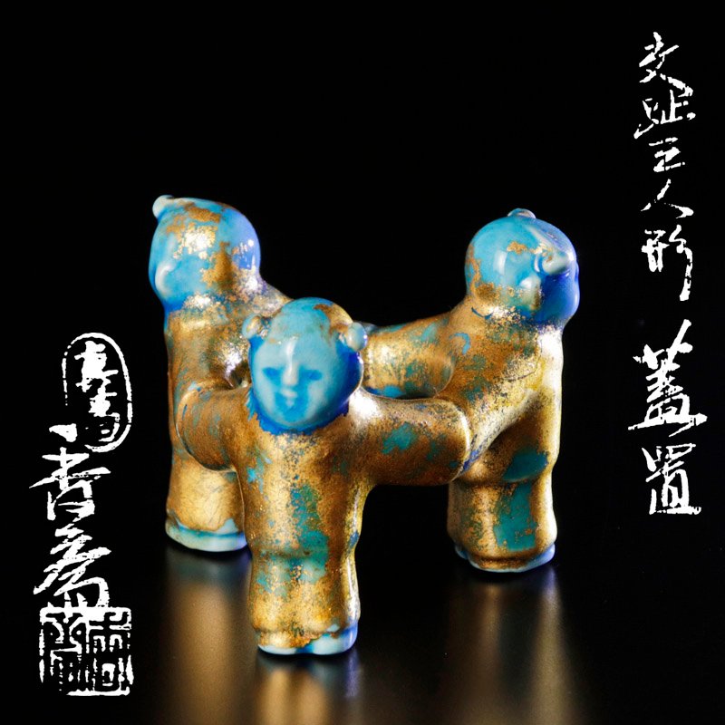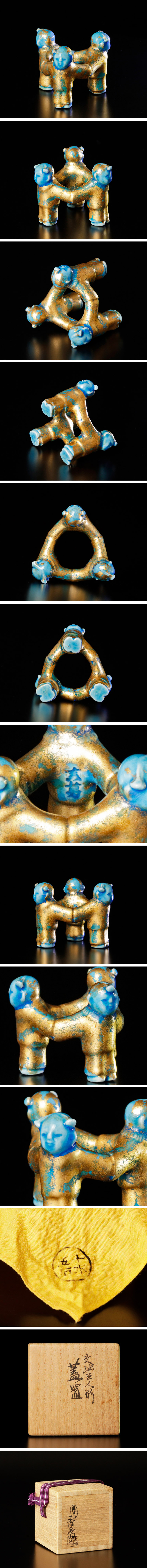 穏やかな表情の三ツ人形に金箔が映え、青の彩りが美しい蓋置です。